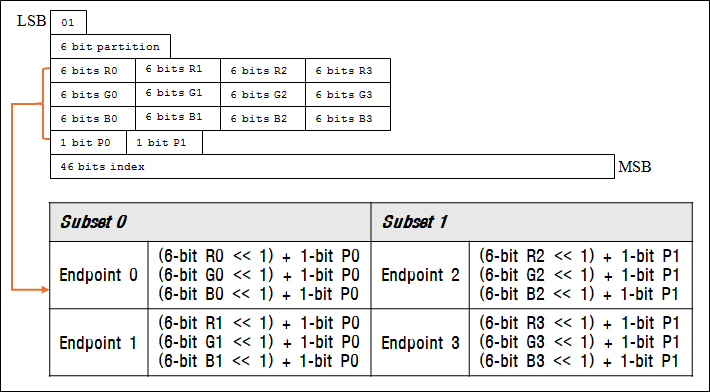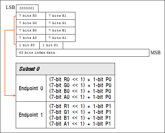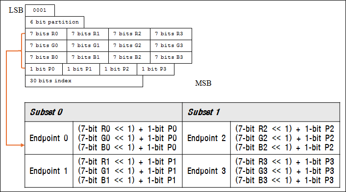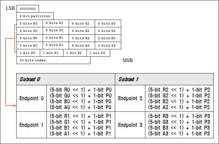 - 알파 채널을 지원하는 경우 각 블록의 Endpoint RGB의 각 채널별 1bit씩 총 3bit를 알파 채널에 할당하여 활용한다.