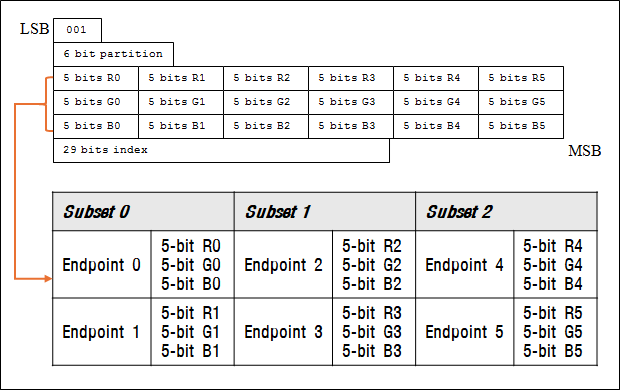 - BPTC는 여러 개의 모드가 존재하며 각 블록의 데이터 크기는 동일해야 한다. 이로 인해 저장해야하는 인덱스 테이블의 크기가 부족하게 되는데 Subset의 개수에 따라 fix-up index를 추가하여 해당 인덱스들은 다른 텍셀의 인덱스에 비해 1비트 적게 저장되며 임의로 지정하는 것이 아닌 파티션의 타입별로 고정적으로 지정되어 있다.