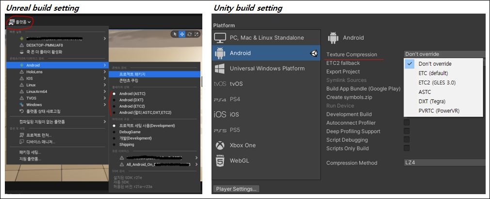 - 주로 iOS 장치에서 사용 가능하며 드물게 Android에서 PowerVR 그래픽 코어를 사용하는 기기의 경우 지원 가능한 압축 방식이다.