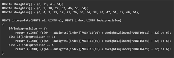 - 구성 요소당 보간 비트는 2, 3, 4비트일 수 있다. 각 비트 수에 해당하는 aWeight2, aWeight3, aWeight4 가중치 테이블이 사전에 계산되어 있으며 보간 비트는 이에 대한 인덱스이다.