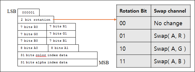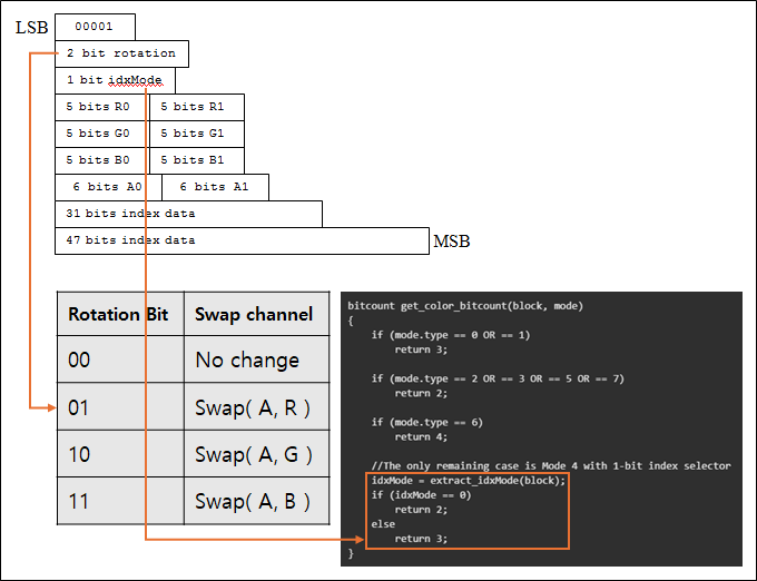 - BC3와 동일하게 알파 채널의 독립적인 인덱스 테이블이 있는 경우도 있으며 다른 채널과의 스위칭도 하드웨어 디코딩 과정에서 처리하기 위해 Mode 4,5에서 회전 비트를 사용할 수 있도록 되어있다.