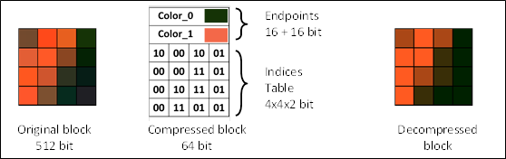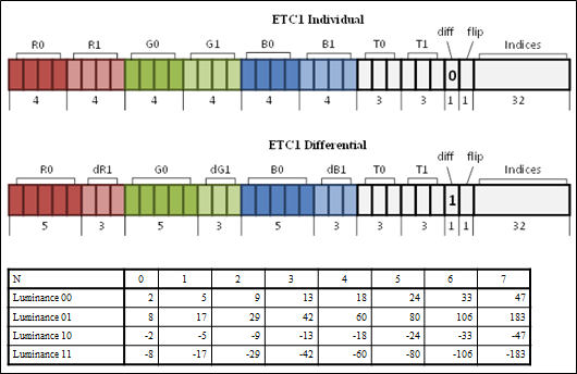 - ETC 블록의 크기는 4x4이며, 두 개의 하위 블록으로 구성된다. Differential 블록 유형은 첫 번째 하위 블록의 기본 색상이 RGB555 정밀도로 저장되고 두 번째 기본 색상에 대해 3bit 오프셋이 저장된다. Individual 블록 유형의 경우 두 기본 색상이 모두 RGB444 형식으로 직접 저장된다.