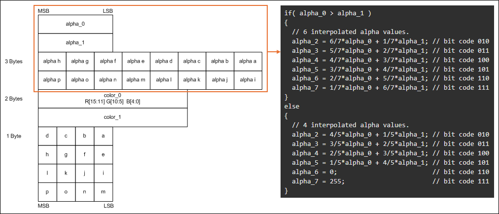 - BC3가 4개의 알파 값만 보간하는 경우 두 개의 추가 알파 값(완전 투명의 경우 0, 완전 불투명의 경우 255)을 설정한다.