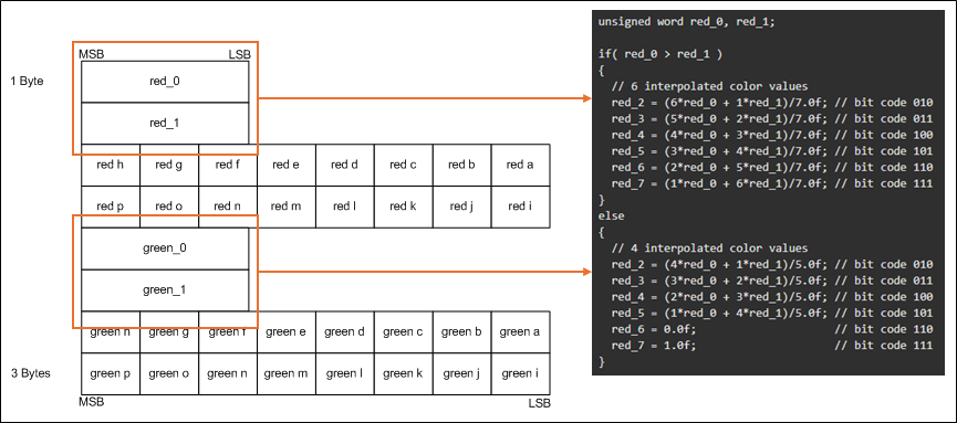 - BC4의 알고리즘은 3bit 인덱스를 사용하여 8가지 색상이 포함된 색상표에서 색상을 찾는다. 저장된 두 색상(red_0 및 red_1)은 최소 및 최대 색상이다. 알고리즘은 선형 보간을 사용하여 나머지 색상을 계산한다.