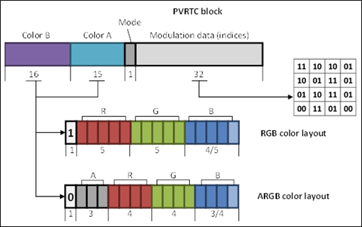 - PVRTC의 주요 목표는 S3TC 및 ETC1과 같은 블록 기반 방법에서 자주 발생하는 직사각형 영역의 불연속성을 피하는 것이다. 텍스처를 독립적인 텍셀 블록으로 간주하는 대신 텍스처를 이중선형으로 확대된 한 쌍의 저해상도 이미지로 나타낸다.