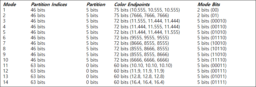 - BC6H는 각 블록에 대한 14가지 모드가 존재하며 모드 번호는 하위 2bit 또는 하위 5bit로 인코딩된다.