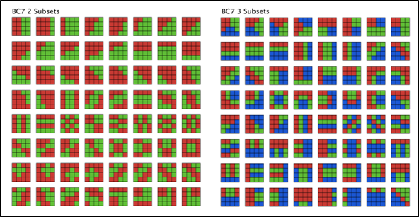 - 원리는 S3TC와 비슷하며 4x4 블록단위로 압축이 이루어지고 블록당 Endpoint가 한쌍이 아닌 최대 3쌍을 보유할 수 있으며, 공간 분할 패턴에 의한 64개의 Partition이 나뉘어 Endpoint 개수에 대한 패턴들이 사전에 계산되어 있어 보간에 사용되는 비트를 늘려 정밀도를 높일 수 있도록 설계되어 있다.