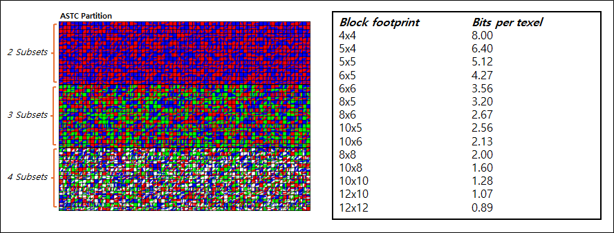 - ASTC는 S3TC/BC7과 유사합니다. 최대 4개의 Subset과 보간 가중치가 압축된 블록에 저장되고 사전 정의된 파티션만 지원되며 파티션 ID는 블록에 저장된다.