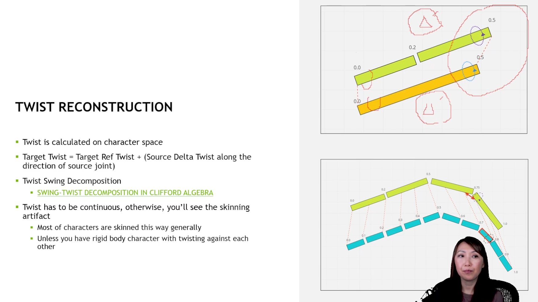 3D 게임에서의 캐릭터만 생각해봐도 캐릭터의 손목을 돌렸을때 Constraint가 없는 Rigging 구조에서는 하위 본의 회전이 일어난다 하더라도 상위 본에 영향을 주지 않고 해당 본에 대한 가중치가 매핑된 폴리곤만 회전이 반영될 것이다. 이렇게 된다면 특정 각도를 넘어갈 수록 캔디래핑 현상이 발생되기 쉽다. 현실에서 사람의 손목이 돌아갈 경우 상위 본인 팔꿈치에도 영향이 간다는 것을 확인할 수가 있다. 이를 해결하기 위해 헬퍼 본 즉, Constraint Bone을 활용하여 회전의 반영 방식에 대한 트릭을 주어 해결할 수 있으며 그 외에도 IK 및 여러 상황에 대한 처리를 보다 유연하게 해결할 수 있다.