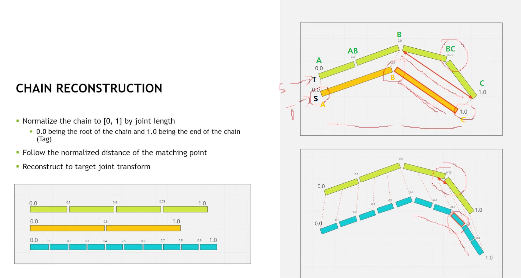 이러한 예측 방식은 IK(Inverse Kinematics)와 동작 방식이 비슷하다. 위 그림에서 T(Target)의 Skeleton과 S(Source)의 Skeleton이 있다고 할 때, 각각 [A,B] & [B,C] 두개의 체인을 구성하였다고 하자.