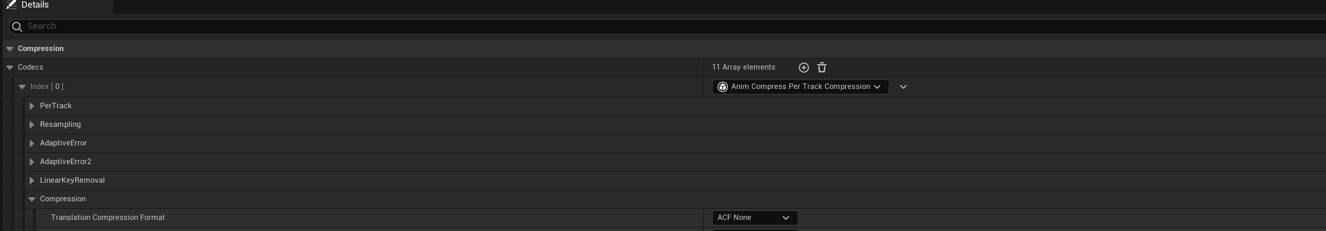 언리얼 엔진에서는 여러가지 압축 코덱을 지원하며 단일 압축 코덱을 설정하여 해당 코덱으로 애니메이션 압축이 진행되는 것이 아닌 적용하고자 하는 코덱을 등록해두고 압축을 실행하게되면 등록한 전체 코덱 후보군에 대한 압축을 시도하여 압축률이 높고 손실율이 적은 최적의 압축 포멧을 자동으로 선택할 수 있는 Animation Per Track Compression기능이 있다. 다만 이 방식은 모든 압축을 시도하므로 수행 시간이 매우 오래 걸리는 단점이 있기도 하다.
