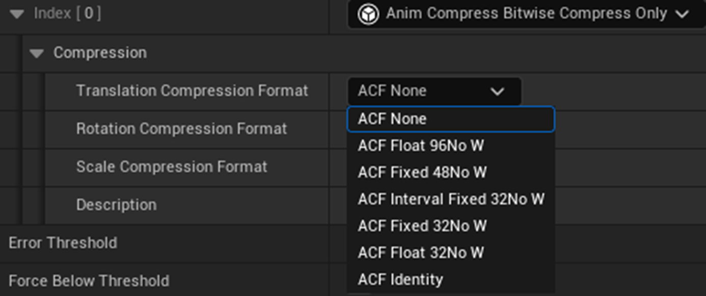 Rotation 키는 쿼터니언을 사용하여 XYZW 4개의 float 채널을 가지고 있고 Translation과 Scale 키는 XYZ 3개의 float 채널을 가지고 있으므로 각 키에 적합한 압축 포멧을 선택해야 하며 Rotation 키의 경우 모든 압축 형식을 지원하지만 Translation과 Scale 키는 비압축, IntervalFixed32, Float96 세 가지 압축 형식만 지원된다.