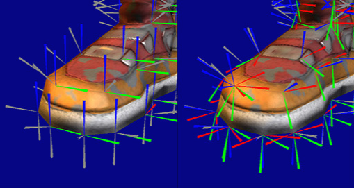 왼쪽의 World 기준 축을 잡게 되면 좀더 세밀한 Light연산이 불가능하다. 오른쪽 이미지처럼 정점 기준 표면의 축을 기준으로 Normal 값을 적용시키게 된다면 좀 더 정밀한 Light 연산을 통해 깊이 있는 이미지를 출력할 수 있게 될 것이다.