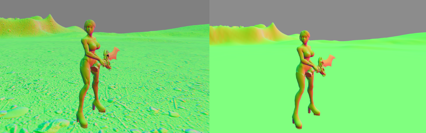위 이미지에서 오브젝트 또는 World Space Normal Mapping(왼쪽), Tangent Space Normal Mapping(오른쪽)을 통해